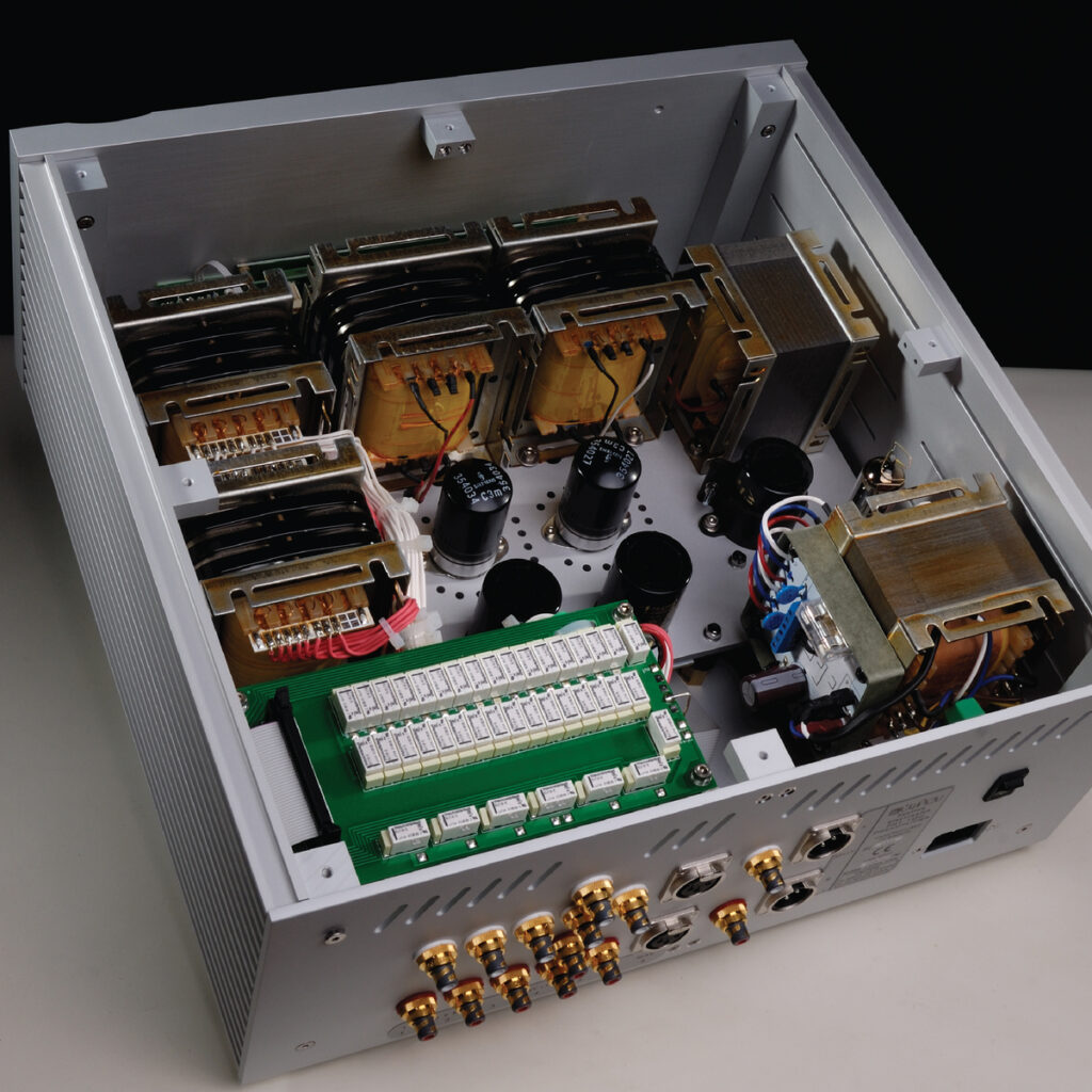 We developed a very special transformer as the means of attenuation, using special winding techniques and highest quality wires and cores. Its performance suppassed that of the best resistor attenuators. In a transformer the magnetic circuit can be ultra linear when the very best core materials are used. The sound of such materials is much more musical and detailed compared with the best resistors. A transformer attenuator with 31 taps is used in the PST100 mk2 providing a total attenuation of 54db in its lowest tap.